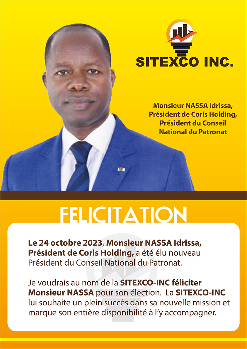 Je voudrais au nom de la SITEXCO-INC féliciter Monsieur NASSA pour son élection. La SITEXCO-INC lui souhaite un plein succès dans sa nouvelle mission et marque son entière disponibilité à l’y accompagner.